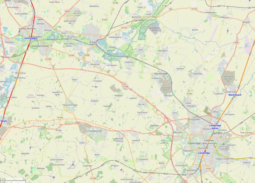 Linking to Huntingdon would be favourable. Cambridge North sits on former Chesterton Junction but it is quite possible an arrangement akin to the Watford – St Albans line could be considered to provide connection options out of Cambridge.
