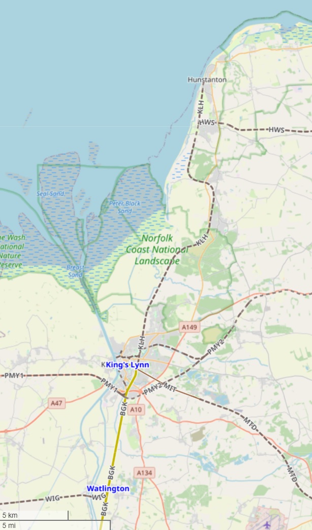 A local steering group would like to see the line to Hunstanton rebuilt as a fully-fledged part of the national rail network. The A149 between these two towns suffer heavily from road traffic congestion, particularly on summer weekends.